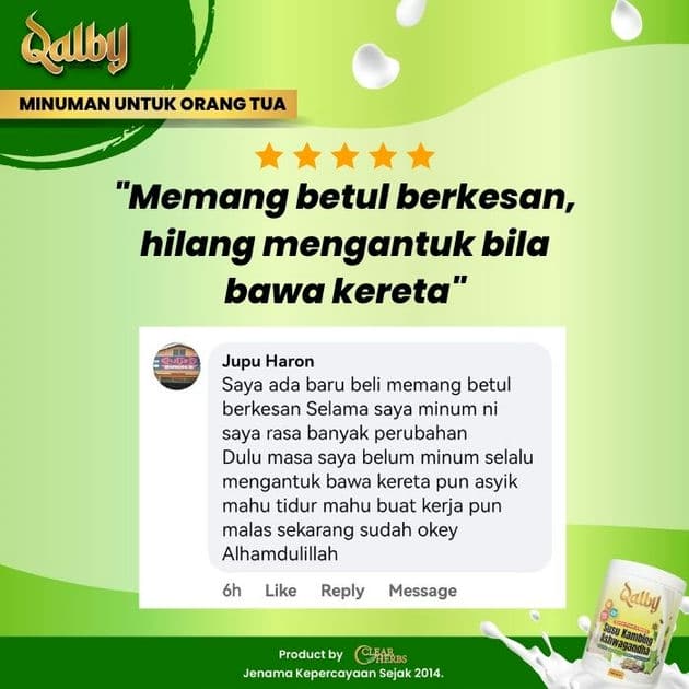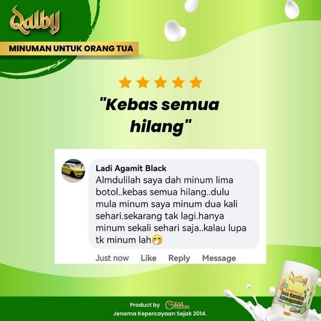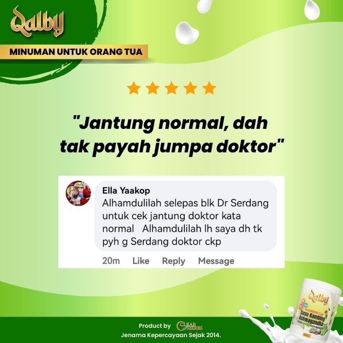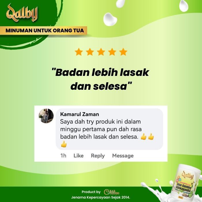Disclaimer: Testimonials found at SUSU KAMBING QALBY and/or from Qalby.my are unverified results that have been forwarded to us by users of the product. The results may vary for each individual and are not intended to represent or guarantee that anyone will achieve the same or similar results within a specific period of time.